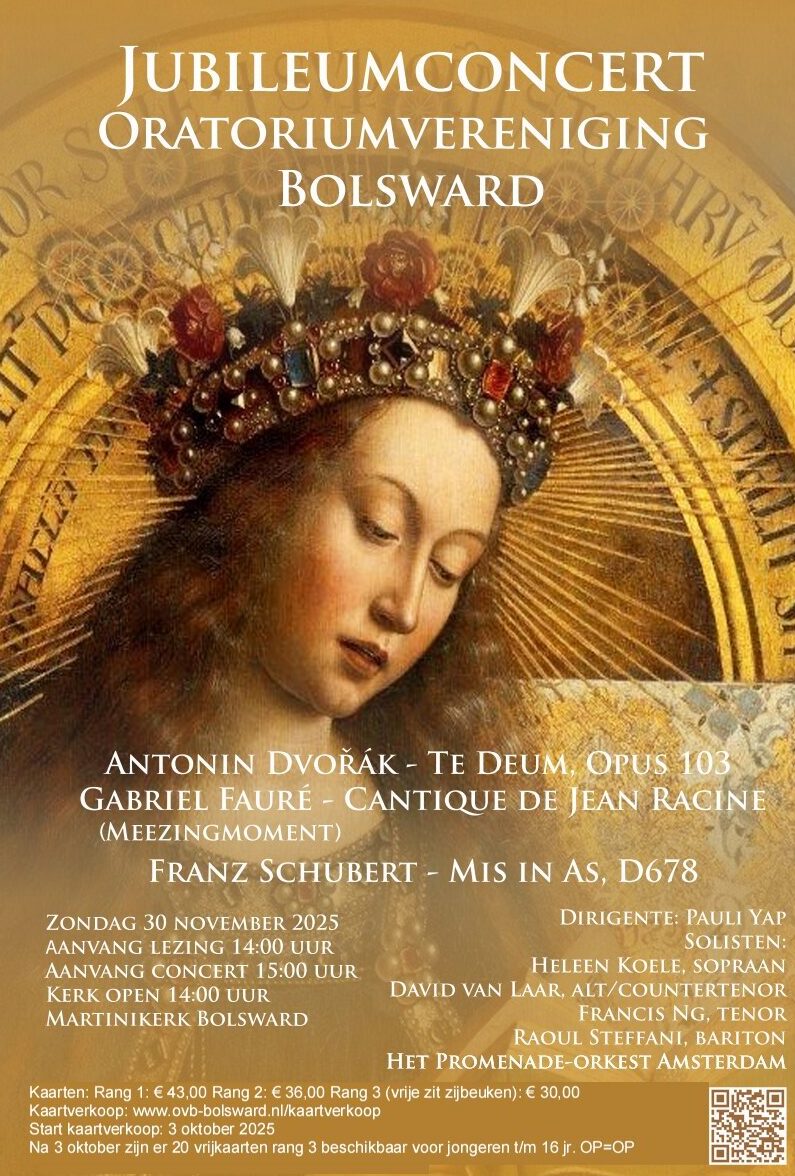 Oratoriumvereniging Bolsward viert haar 80-jarig jubileum met een groots en feestelijk concert in de Martinikerk. Onder leiding van dirigente Pauli Yap, die zelf haar 25-jarig jubileum bij de vereniging viert, brengt het koor drie indrukwekkende werken: het feestelijke Te Deum van Antonín Dvořák, de ontroerende Mis in As van Franz Schubert en het ingetogen, romantische Cantique de Jean Racine van Gabriel Fauré. Samen met Het Promenade Orkest Amsterdam, vier gerenommeerde solisten en veertig gastzangers belooft dit jubileumconcert een muzikaal hoogtepunt te worden vol emotie, traditie en vakmanschap. Voorafgaand aan het concert geeft Ebo Reitsma om 14.00 uur in het Convent een inleidende lezing over de uit te voeren werken.