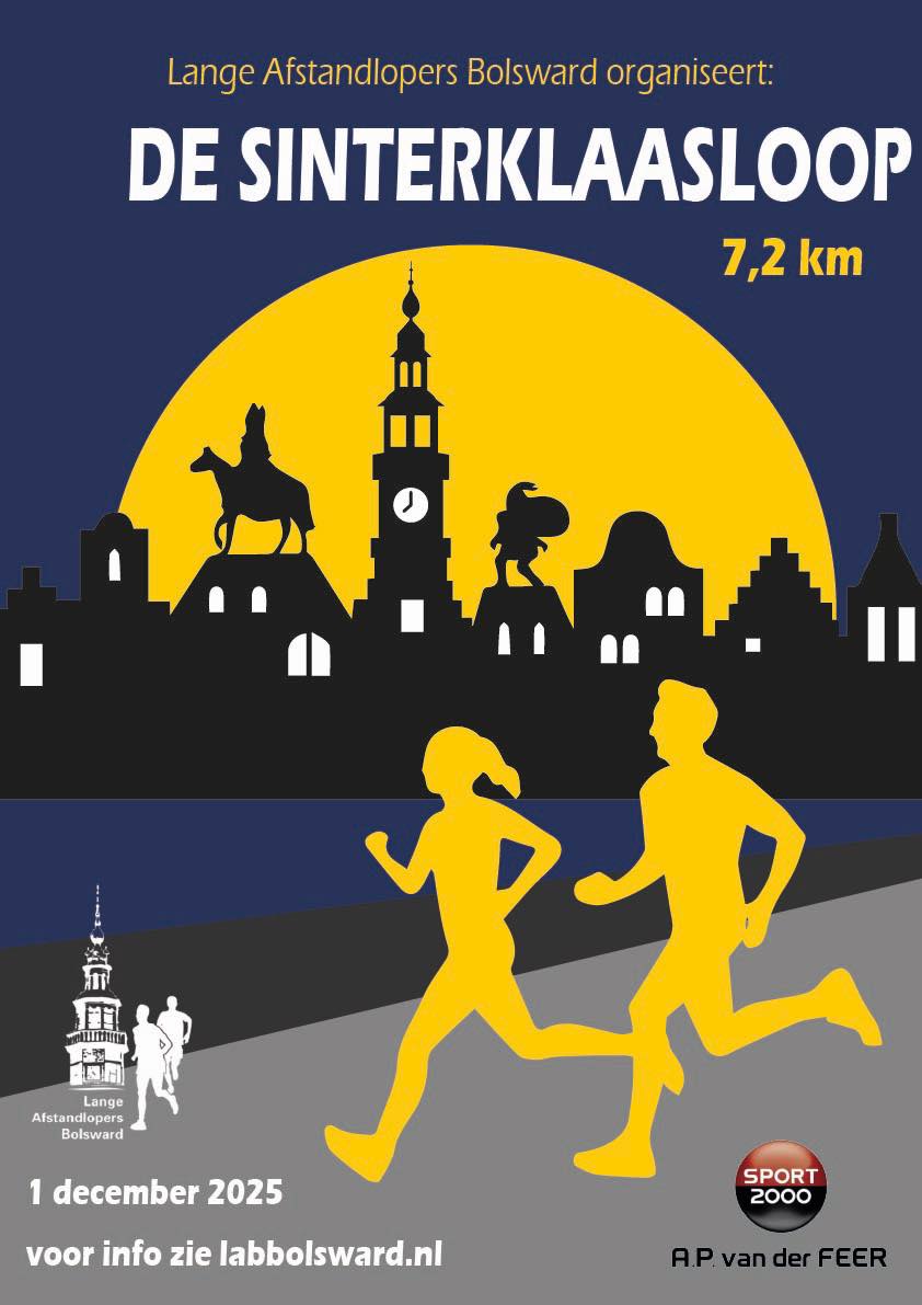 De Sinterklaasloop is voor velen inmiddels een echte traditie in Bolsward. Op de laatste maandag voor pakjesavond verzamelen hardlopers zich voor deze gezellige avondloop door en rond de stad. De route van 7,2 kilometer start bij Sporthal De Middelzee aan De Blink 5, waar Sinterklaas zelf om 19.00 uur het startschot lost. Dankzij elektronische tijdmeting worden de uitslagen na afloop zo snel mogelijk op de website geplaatst. Ook dit jaar maakt Sporthuis AP van der Feer deelname extra leuk met een verloting op startnummers. Onderweg zorgen zo’n 25 verkeersregelaars voor een veilig verloop van de loop.