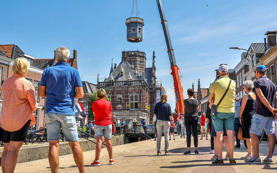 Een bijzonder moment tijdens de restauratie van De Tiid was de herplaatsing van de karakteristieke toren. Tijdens de renovatiewerkzaamheden bleek dat het eikenhouten frame ernstig was aangetast door onder andere de bonte knaagkever. De toren werd volledig gedemonteerd en overgebracht naar een restauratiewerkplaats in Sneek, waar ambachtslieden maandenlang werkten aan het herstel van het historische houtwerk. Op dinsdag 1 juni 2021 werd de volledig gerestaureerde toren onder grote publieke belangstelling teruggeplaatst op het gebouw, met behulp van een grote hijskraan. Deze herplaatsing markeerde een symbolisch en technisch hoogtepunt in de transformatie van het oude stadhuis naar Cultuur Historisch Centrum De Tiid, waarbij het gebouw letterlijk en figuurlijk zijn kroon terugkreeg.